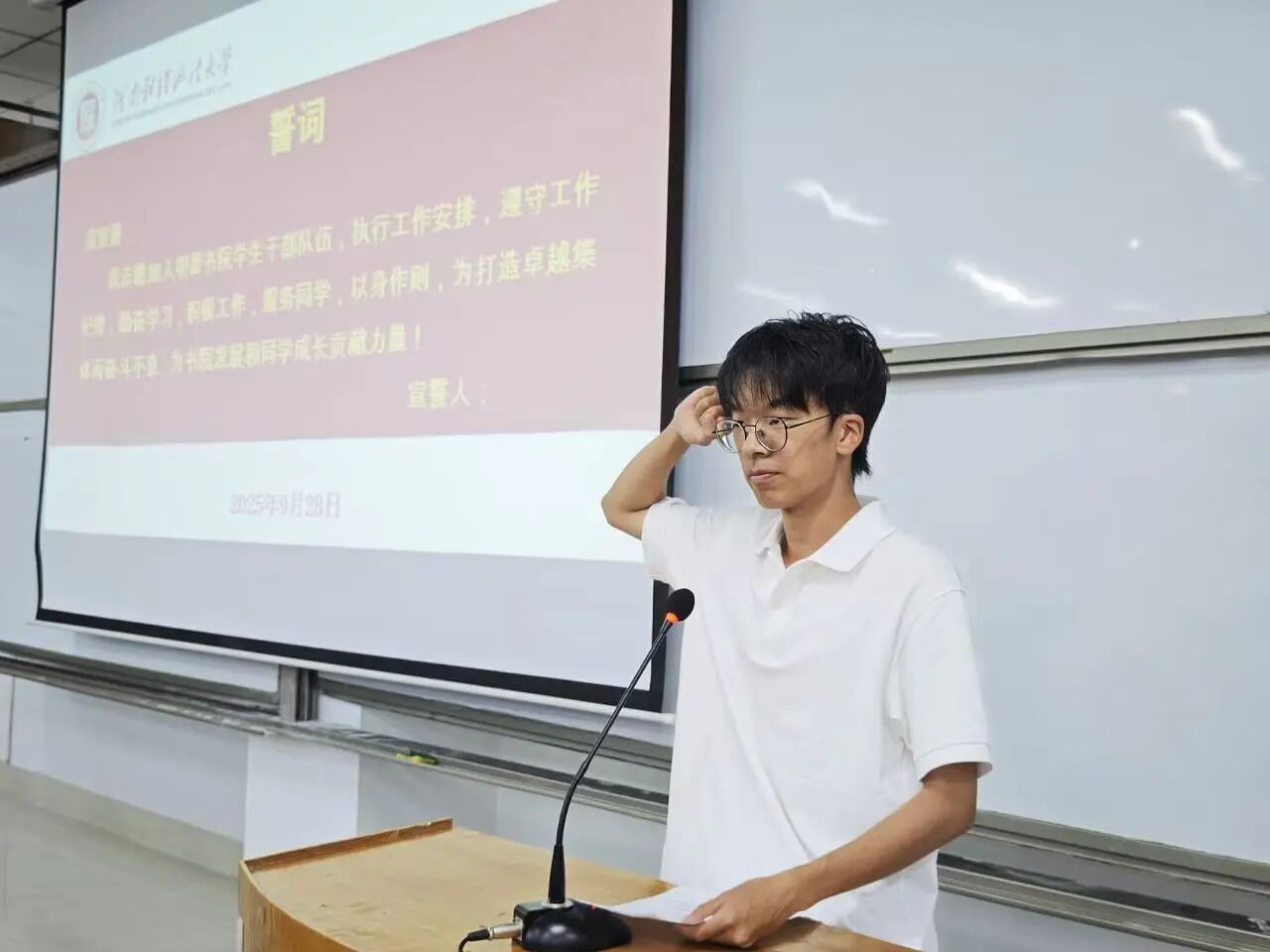 在2025级第一社区学生会主席团成员张照基的带领下,全体新任学生干部庄严宣誓。铿锵誓言回荡会场,传递出同学们恪守学生本分、牢记服务宗旨、勤勉务实做事、永葆理想情怀的坚定信念。