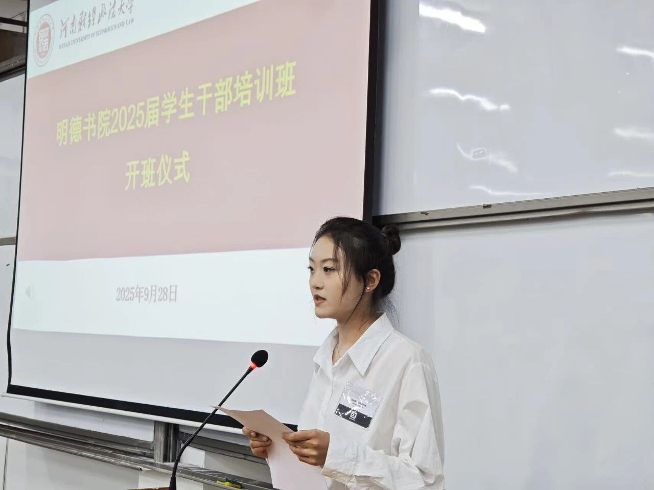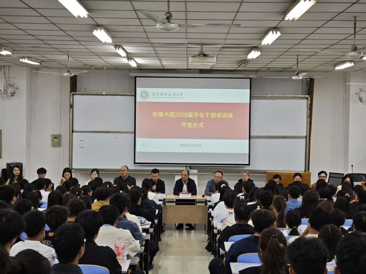 为明确学生干部培养目标,凝聚思想共识,增强责任意识与使命感,9月28日晚,河南财经政法大学明德书院2025级学生干部培训班开班仪式在十阶三教室顺利举行。书院党委书记王廷伟、党委副书记何海涛,全体辅导员及2025级学生干部共同参加。仪式由党委副书记王帅主持。
