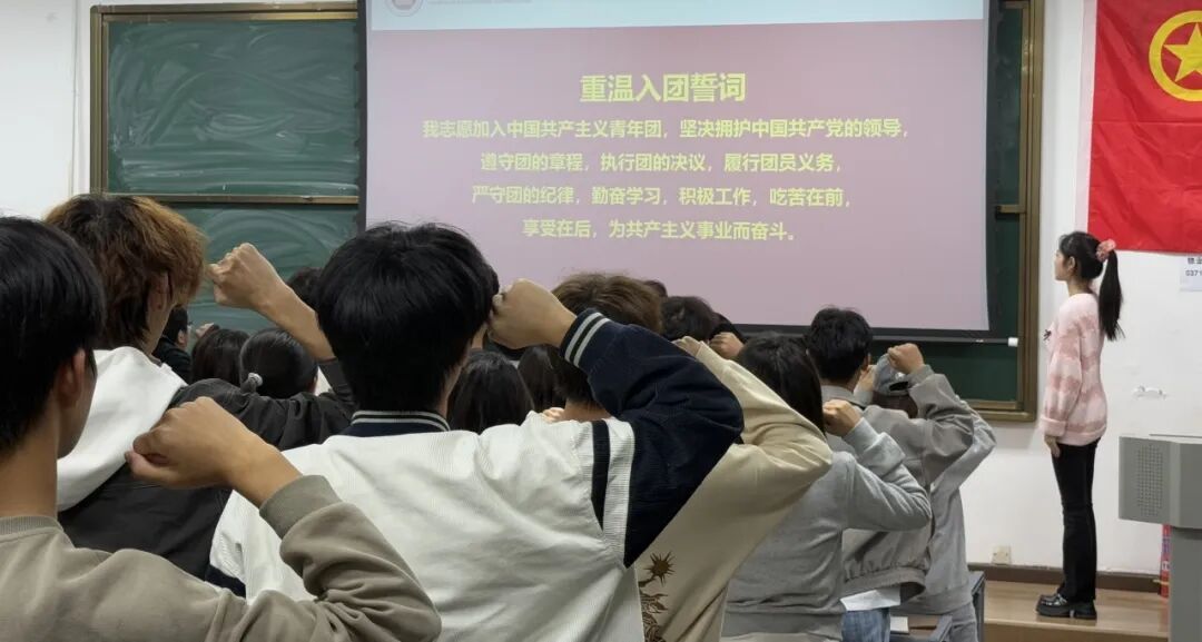 在团委组织部部长闫科蒙的带领下,全体与会人员重温入团誓词。铿锵庄严的誓言回荡在会场,激励着每一位学生干部不忘初心、牢记使命。