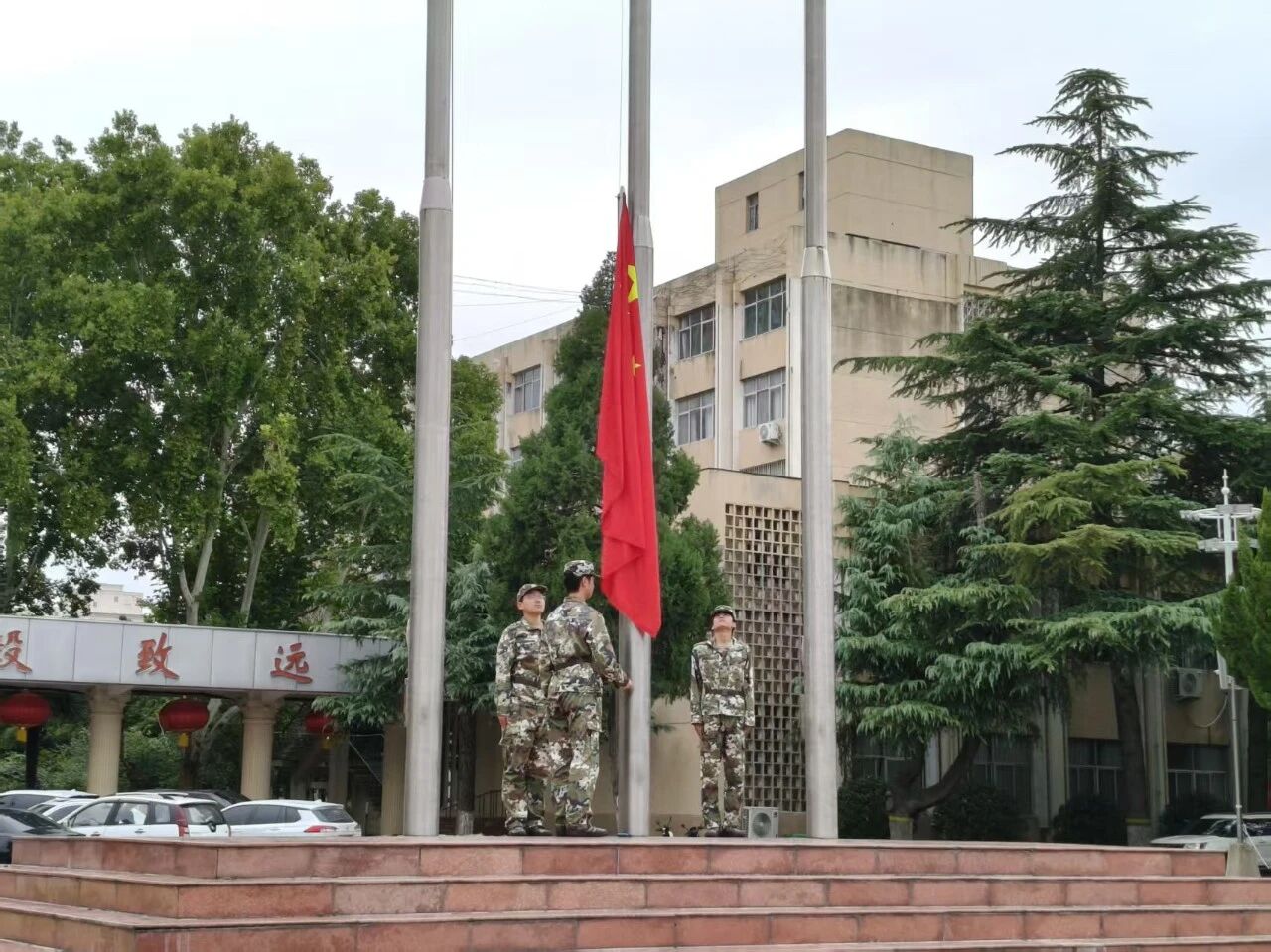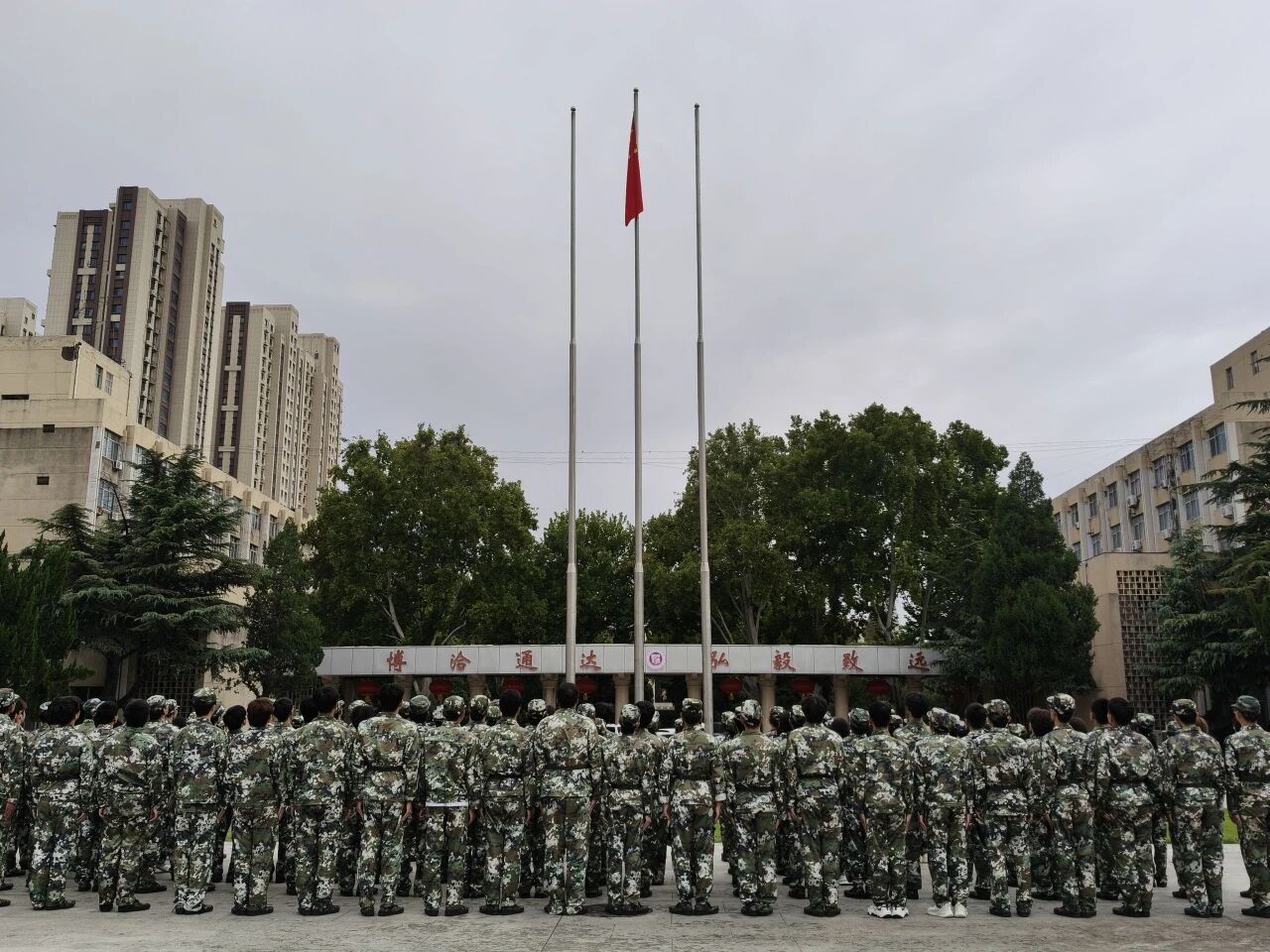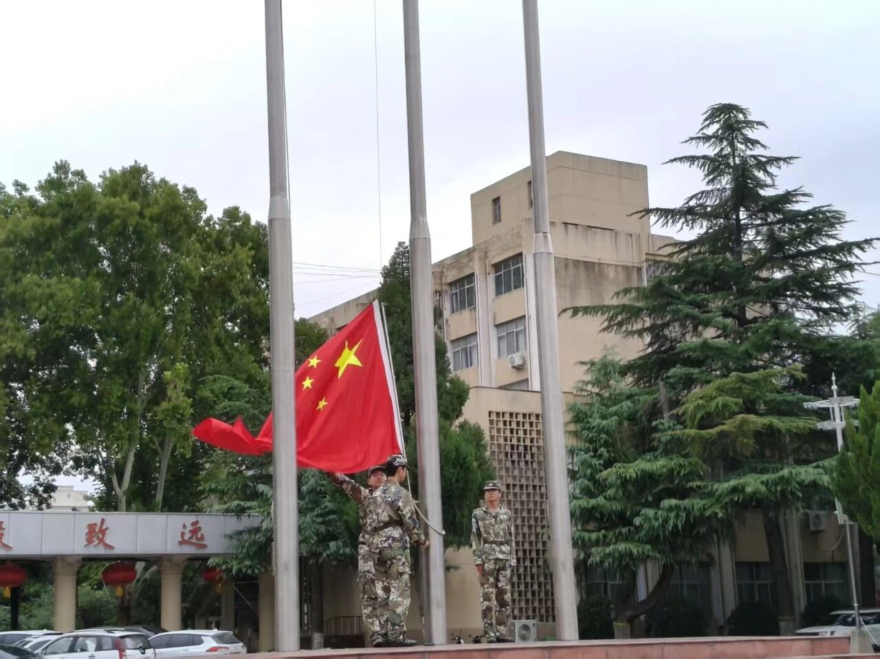 伴随着雄壮激昂的《义勇军进行曲》响起,主旗手振臂一挥,五星红旗冉冉升起,在细雨中迎风飘扬。两名护旗手肃立两侧,庄严护卫。全体同学齐声高唱国歌,激昂的旋律与淅沥雨声交织,爱国情怀在每位学子心中激荡。