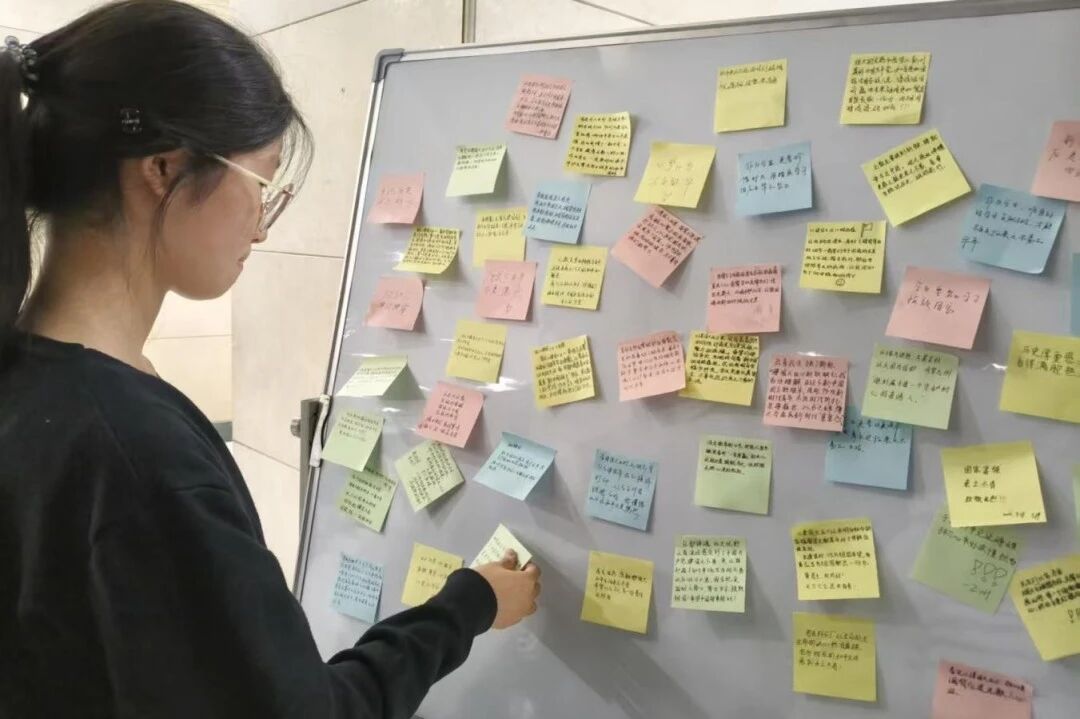 随后,工作人员分发了精心准备的便利贴。同学们将满腔热情化作一行行真挚的文字,郑重写下对祖国母亲的深情祝福,一张张便利贴,汇聚成一片赤诚的“祝福墙”,承载着明德学子对祖国最美好的祈愿。