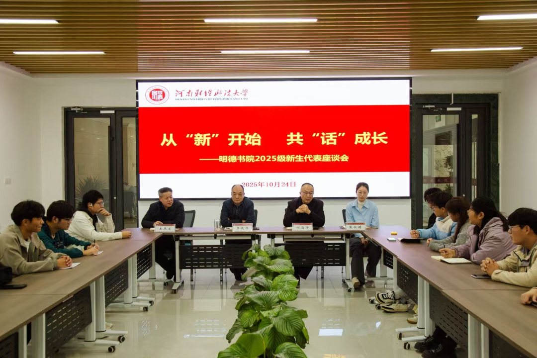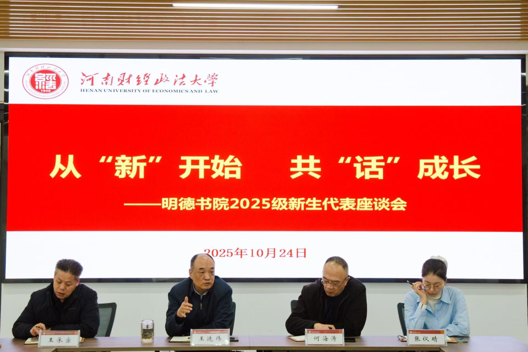 为深入了解新生入学适应情况,倾听新生心声,搭建书院与新生间的高效沟通桥梁,明德书院于10月24日下午在10号楼一楼西侧会议室召开2025级新生代表座谈会。明德书院党委书记王廷伟、党委副书记何海涛、办公室主任王承宗、明德书院第一社区学生服务中心辅导员张仪晴出席,各社区新生代表参加会议。
